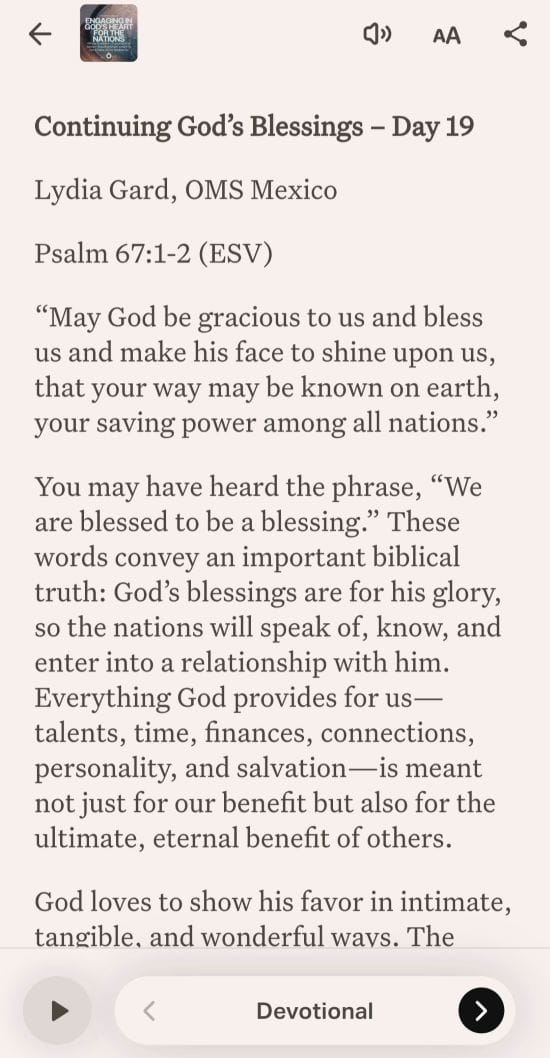 One Mission Society (OMS) posted its first devotional in the well-known YouVersion app a couple months before my last day serving as associate editor in the OMS USA Communications Department.